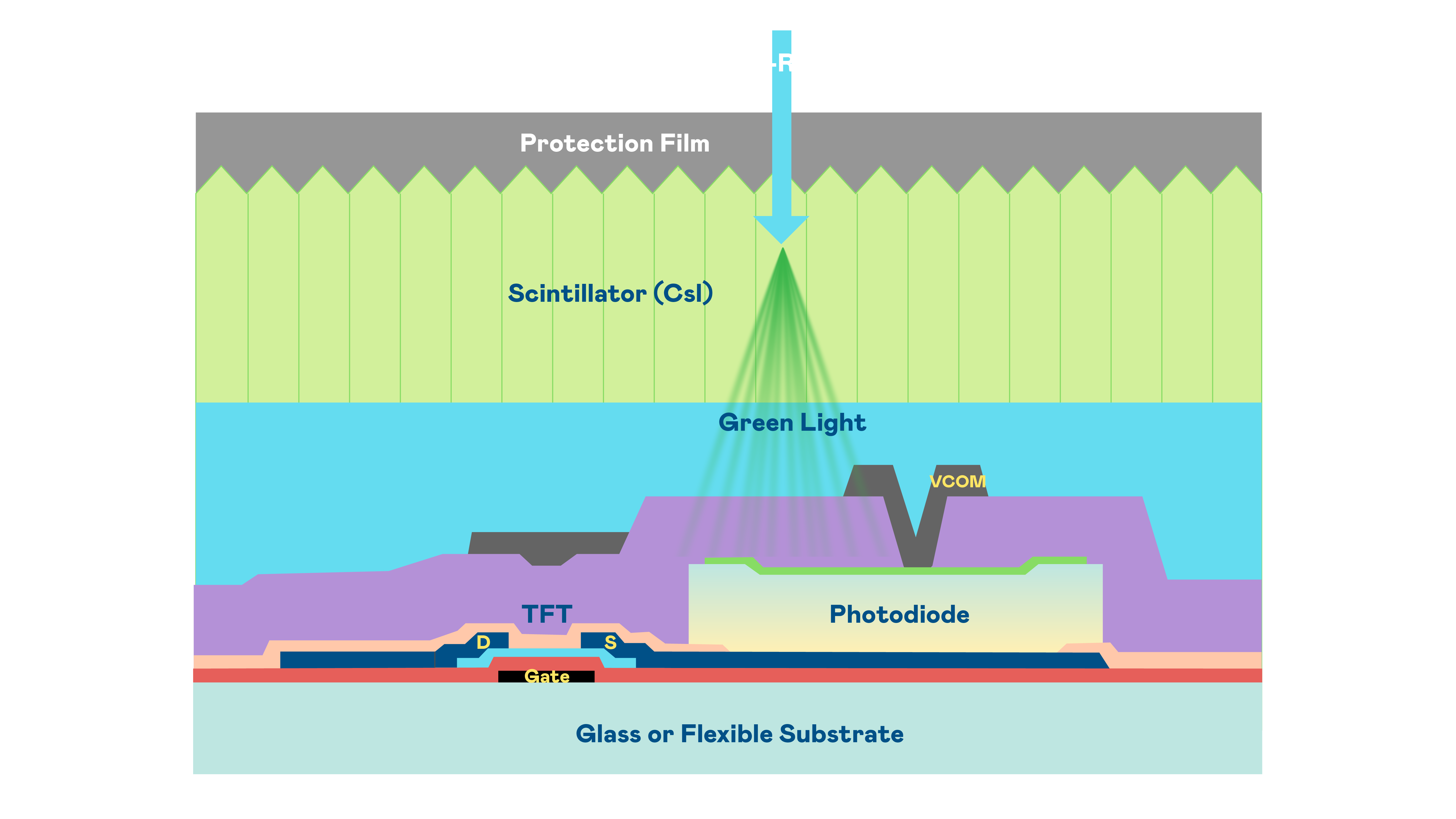 拉斯维加斯5357的X光影像感测阵列使用薄膜电晶体 (TFT) 作为每个像素的读取开关,搭配光电二极体(Photodiode)的光电转换元件,用以感测X光影像讯号。